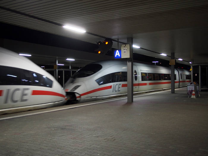 少し遅れてやってきたICE。都市間超特急、ドイツ版新幹線ですが、車内の通路、座席間の通路