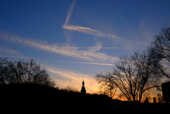 撮影が終わってから街中に出ましたが、街中に着いた頃には陽が沈む直前で夕焼け空が広がっていました。しかしこの空の青空と雲のオレンジ色が木々のシルエットに映えて美しく感じられます。同時に、陽が沈んでいくのに合わせて、今いる明るい世界が吸い込まれていきそうな感覚を覚えました。