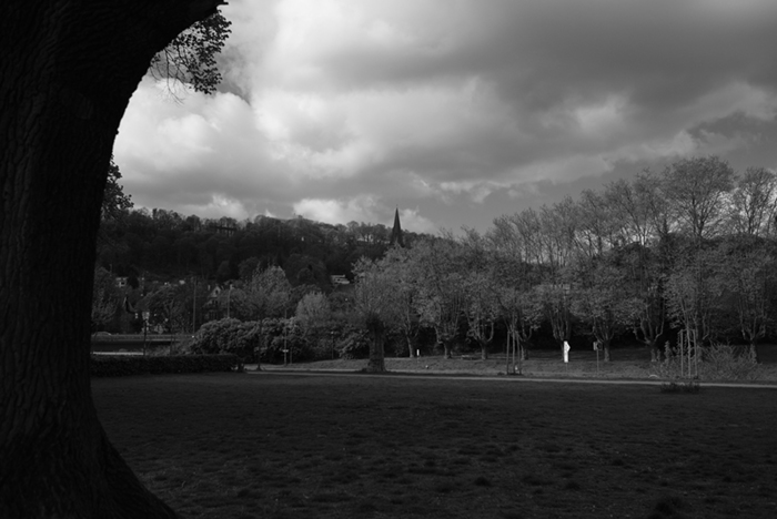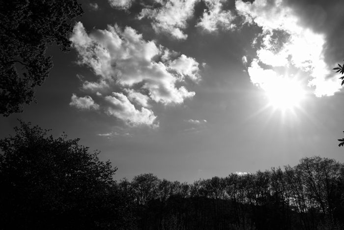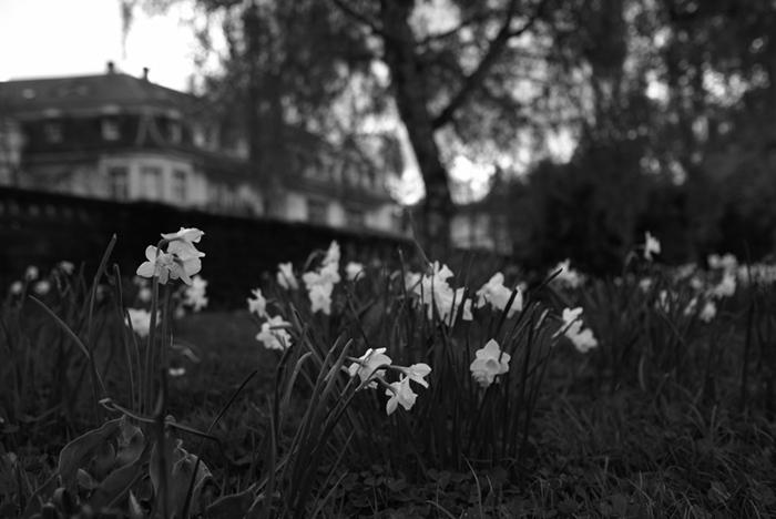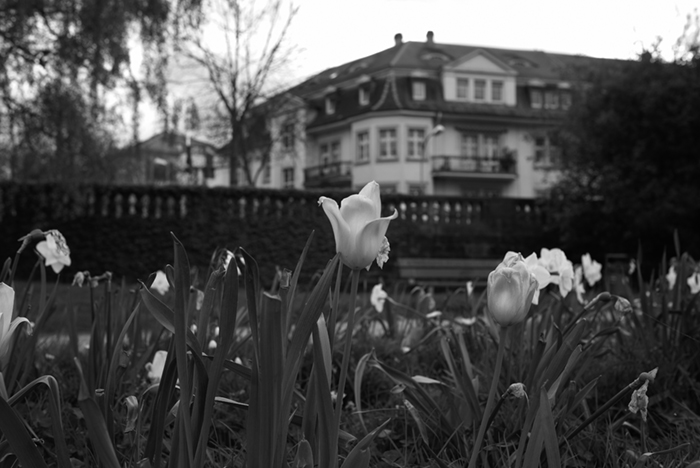 午前中、外出時からの帰りに富士フイルムX-Pro2のフィルムシミュレーションACROS-Rで撮りました。空を見上げれば青空と雲の境目が、足下を見れば地面と花の境目があるように感じられたので、それを意識しました。カラーよりもモノクロの方がそれをより強く感じられる気がします。そこにモノクロの面白さ、奥深さがあるように思います。