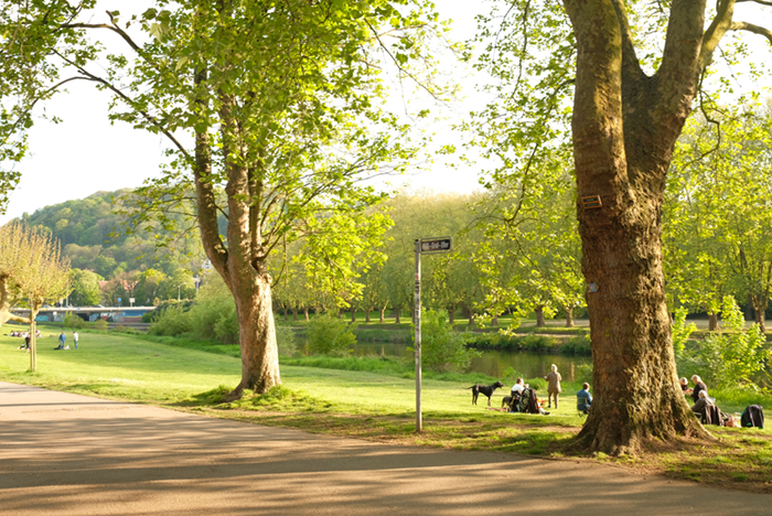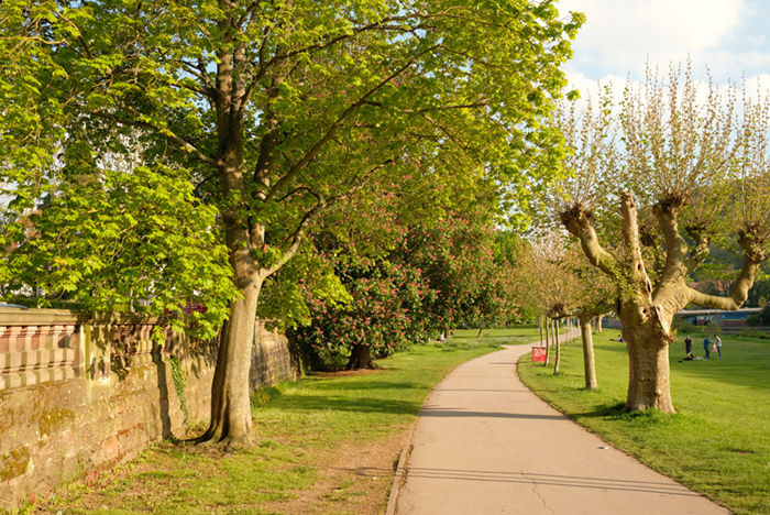 この道を歩くとき、この曲線が美しいといつも思います。今となっては風景に溶け込んでおり、あまり意識しないことかもしれませんが、これが作られた当時、おそらく19世紀後半、20世紀初頭では、車が走っていないので、道路というより今よりも人に近い場所だった気がします。また何故これが曲線を描いているのか、直ぐ側を流れるザール川の地形に影響していると思いますが、これを設計した人や、当時ここを歩いていた人のことを想像すると、この場所が何か人の想いが詰まった場所のように感じられます。