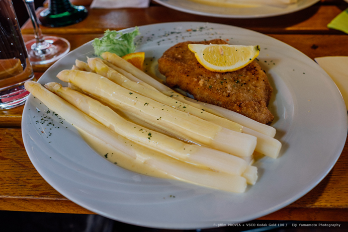 白アスパラとシュニッツェル(カツレツ)を注文。