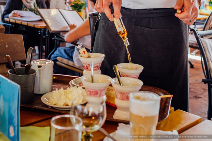食後にケーキとリューデスハイムの名物であるリューデスハイマーカフェ(リューデスハイムコーヒー)を注文しました。小さな小瓶はアルコールで、丸々一本入れた上にコーヒーを入れて、さらに生クリームを載せます。