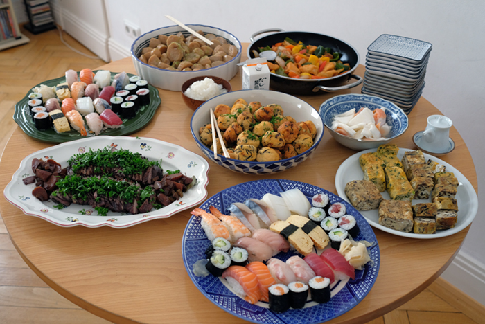 友人宅での持ち寄りパーティーです。お昼過ぎから始まり、深夜1時過ぎにお開きになりましたが、飲んで食べて笑って、時間が過ぎるのが非常に早く感じられた一日でした。気付けば夜になっていたという感じです。テーブルの上には美味しそうなものが並んでいます。実際はこれら以上にあり、いずれも美味しいものばかりでした。