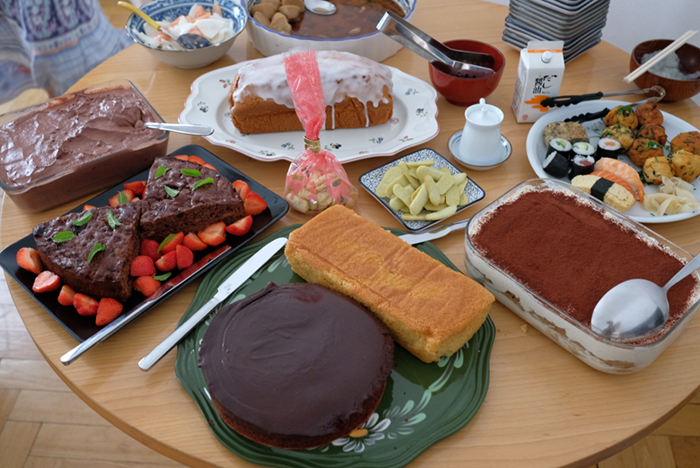 我が家はデザートをお願いされたので、手前の丸いチョコレートケーキ、横のカステラ、その横のティラミス、中央の抹茶のクッキー、その後ろのレモンケーキの計5種類を焼いていきました。