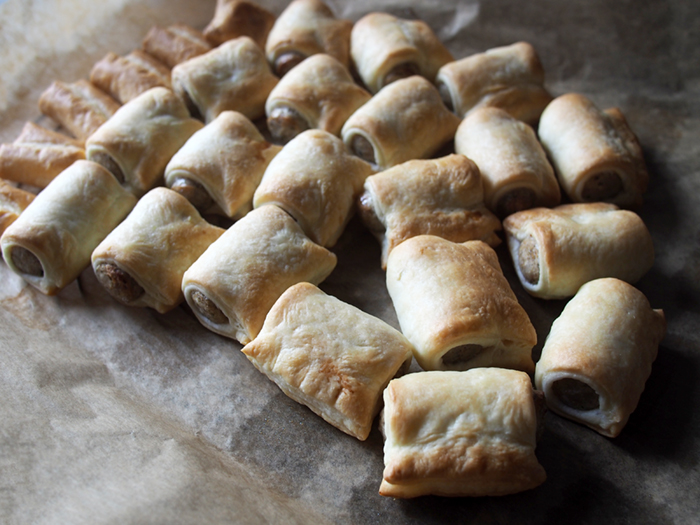 市販のピザやお菓子以外に、ニュルンベルガーソーセージをパイ生地で巻いてオーブンで焼いたものを用意しました。さくっとしていて美味しいです。