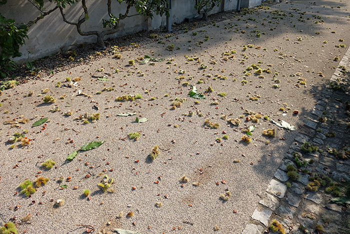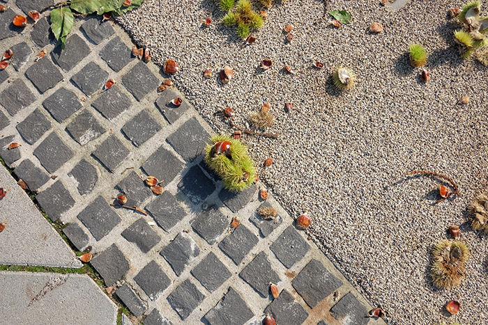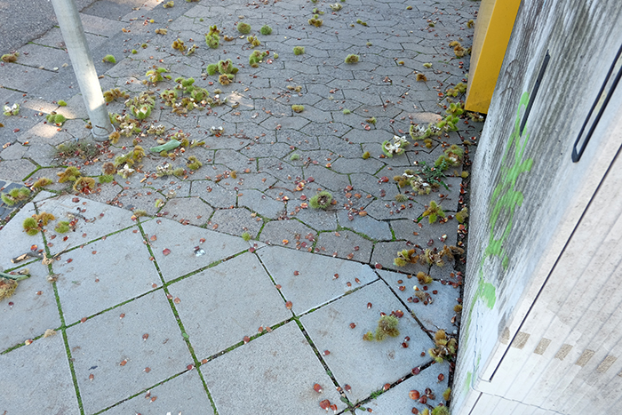 昨日できなかった撮影のために今日もザールブリュッケン城に向かいましたが、その途中に足下を見ると綺麗な色の大きな栗が落ちているのが見えました。