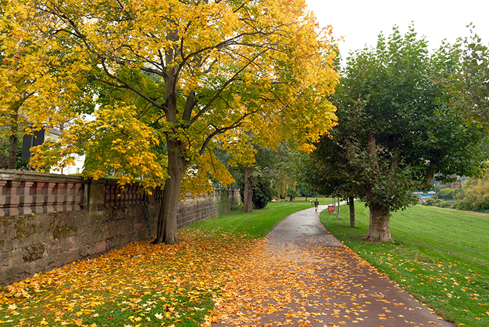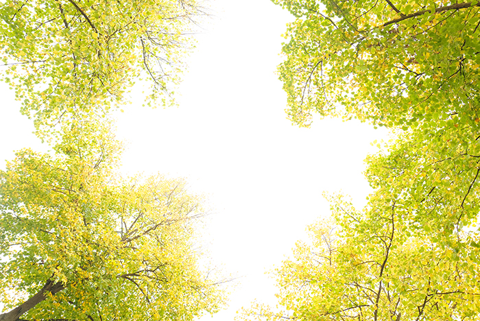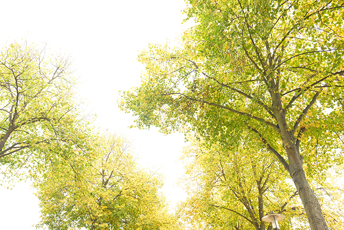並木道を見上げると緑と黄色のグラデーションが楽しめます。空は曇り空ですが、その方がその緑と黄色の色が綺麗に見えます。少し歩いては撮り、また少し歩いては撮り、秋を探しながら歩いていました。