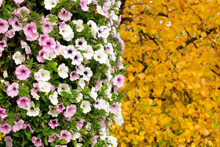 写真は飾られた花と黄葉。まるで二色弁当のようです。