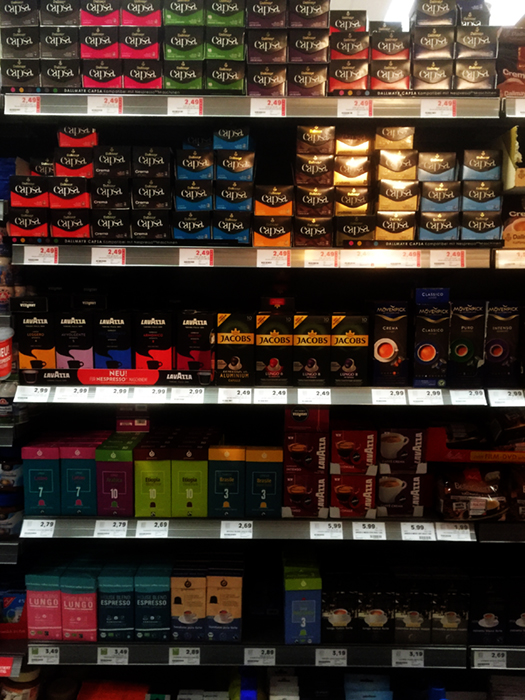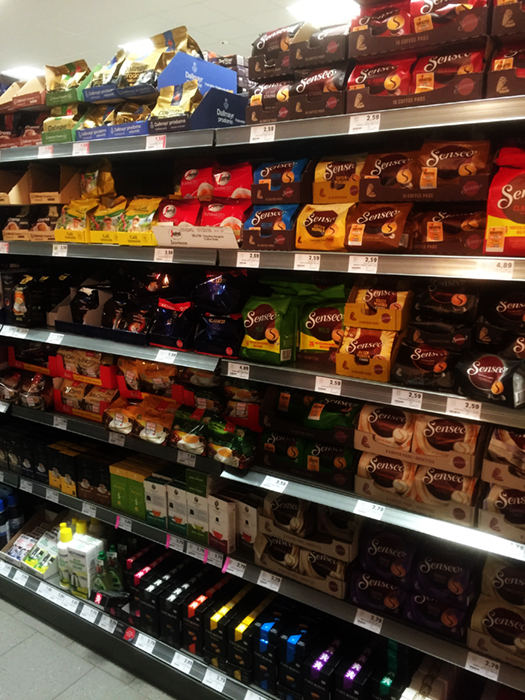 スーパーではコーヒーポッドやネスプレッソ以外のコーヒーメーカーのカプセル、フィルターが売られています。ドイツではコーヒーメーカーの種類も多く、そのフィルターの種類も多いです。そういえば一般的にはドイツ人はビールをよく飲むと言われていますが、実際はそれ以上にコーヒーの消費量が多いということ。以前その記事を読んで驚いた記憶がありますが、スーパーのこういった光景を見ればそれも納得できます。