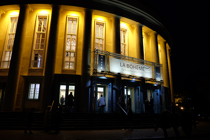 オペラを観にザールラント州立劇場に行きました。今日がプレミエの「ラ・ボエーム」(プッチーニ作曲、1896年初演)です。「好きなオペラは何か」と聞かれたときに、この作品を上げる人が多い、もしくは人気上位に必ず入ると思われるほどに人気のある作品です。この劇場でも随分早くからプレミエ公演は完売になっていました。それだけ期待も大きいと思われます。天気は時々雨が降っていたので、外で待つ人も少なく、劇場前はひっそりとしていたのですが、中に入ると正装でシャンパンを飲んでいる人が多く、プレミエ公演独特の雰囲気がありました。