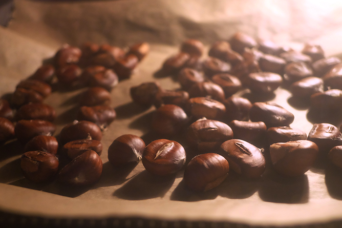 先日、友人から栗をいただきました。山で拾い集めてきたもののお裾分けということ。食べられる栗と食べられない栗があるようですが、自分には分かりません。別の友人は栗のペーストを作っていましたが、とりあえず皮をむきやすくするためにオーブンで焼きました。