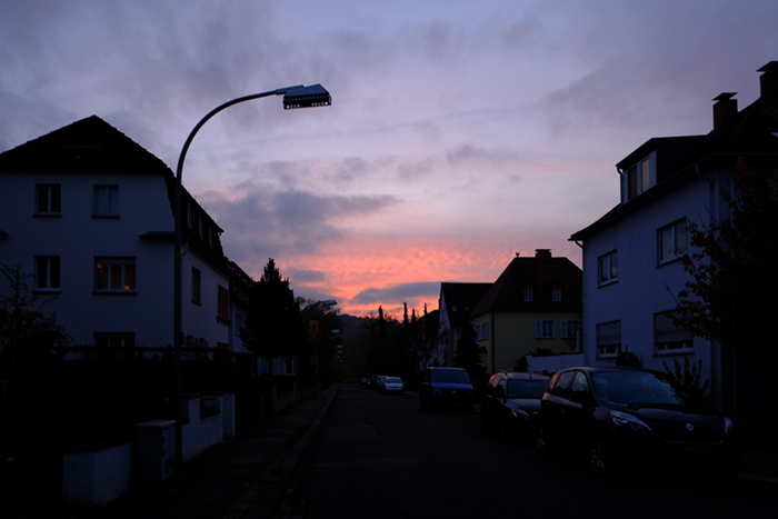 別の通りの遠くには夕焼けが見えています。何となくですが、久しぶりに夕焼けを見た気がしました。