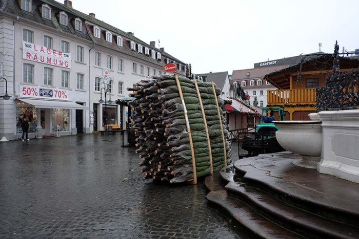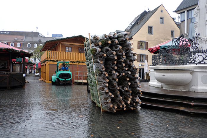 クリスマスマルクトの準備が始まっています。マルクトに飾られるであろうもみの木が束になって置かれています。