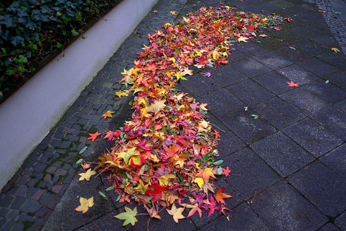 今日は次の撮影の打ち合わせでした。その時に住宅街を通ると色とりどりの落ち葉が綺麗に集められていました。まるで真っ暗な宇宙の中にそこだけ色があるようにも感じられます。
