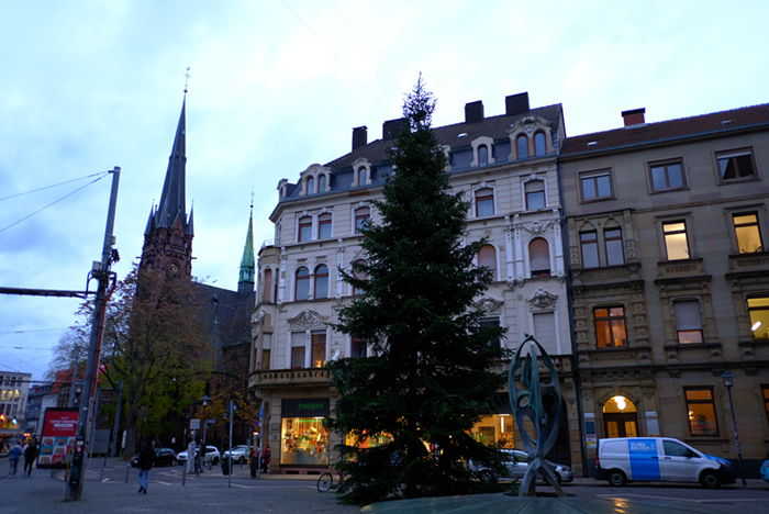 街中に出かけたときにクリスマスマルクトの場所を通りました。街灯には飾りが付けられています。