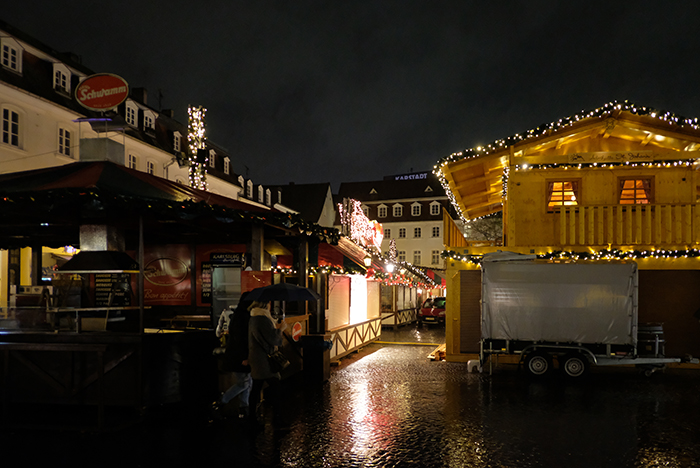 夕方、外出時に撮りました。クリスマスマルクトの準備が進んでいます。今日は既にライトアップされていました。雨で濡れた石畳にその光が反射して良い光景を作り出しています。クリスマスマルクトは27日からでまだ始まっていませんが、この光景だけ見ると既に営業が終わった夜のクリスマスマルクトのようにも見えます。