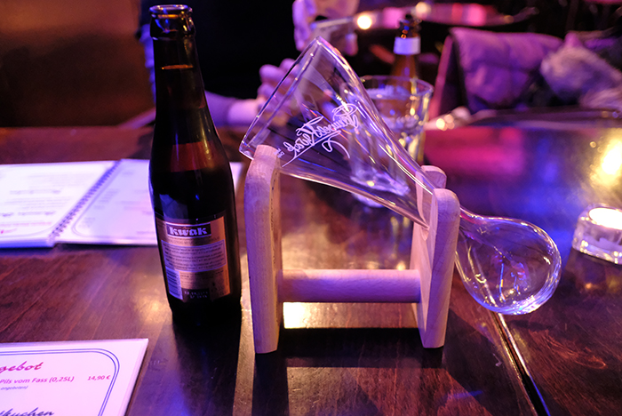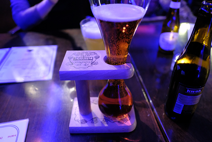 実験器具のようなビール、kwakを注文。毎回一杯目はこれを注文しています。
