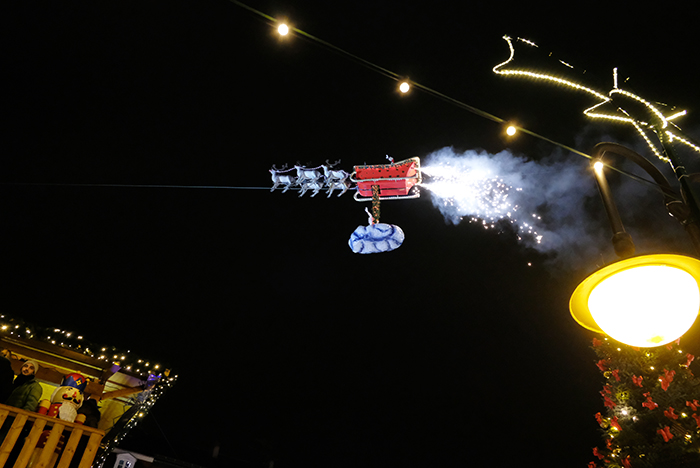 スポンサーの紹介や色々な人の挨拶がなされています。そしてもみの木の電飾カウントダウンが始まりました。が、上手く点灯しなかったようで、その後暫くして点きました。これが点いて正式な始まりです。そのまま最初のイベント「空飛ぶサンタクロース」が始まりました。