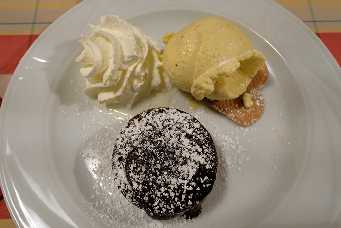 お店おすすめのチョコレートのケーキを注文しましたが、それ以上にバニラアイスが本物のバニラで非常に美味しいアイスでした。そういえばこのお皿も温かいケーキが載っているので、そうでしたが、パスタの皿も料理が冷めないよう温めてありました。