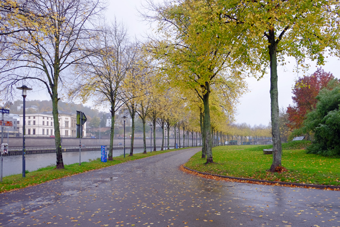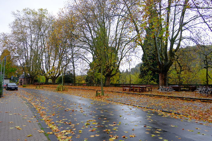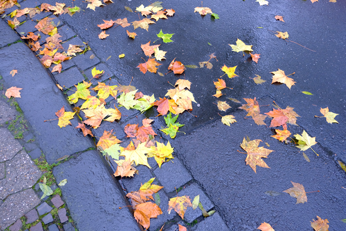 雨に濡れた地面や色とりどりの葉が美しいです。