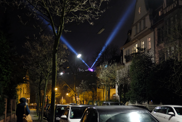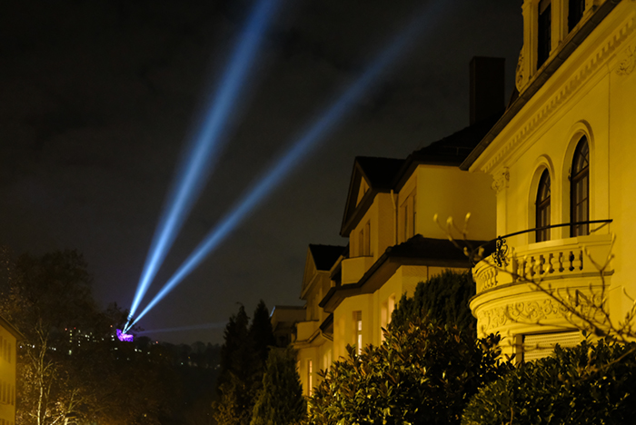 その撮影の帰り、山の上にある病院からサーチライトのようなレーザー光線が回転しながら夜の空を照らしていました。何か啓蒙的なことなのか、それともイベントか、調べてみても分かりません。