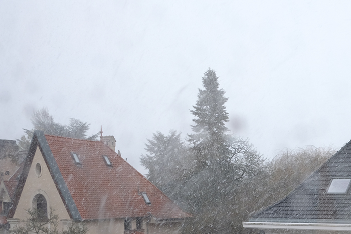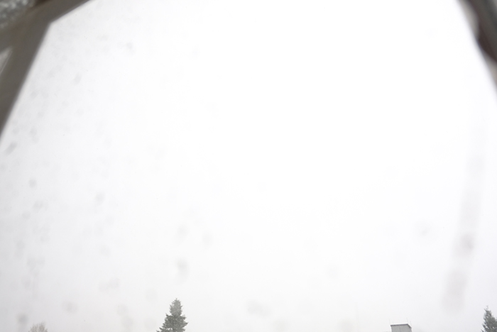 午前中、部屋で撮影していると、外では雨の音が聞こえてきました。音が止んだと思えば真っ白で雪が降っています。