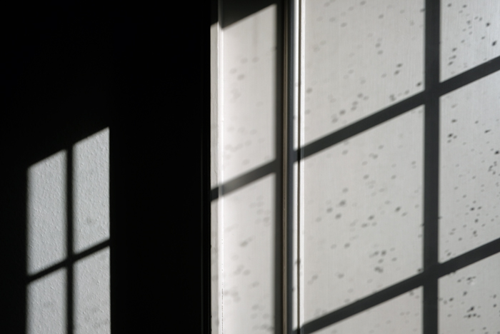 壁に濡れた窓ガラスが映っています。