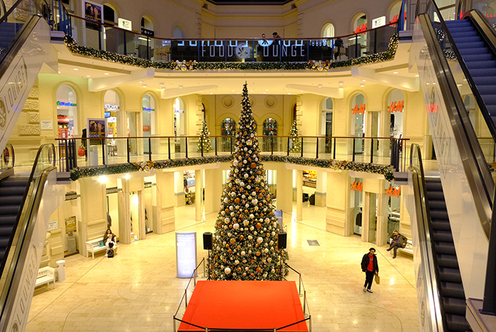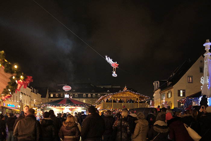 屋台の小屋の上にある装飾のサンタクロースと「空飛ぶサンタクロース」の共演です。