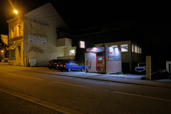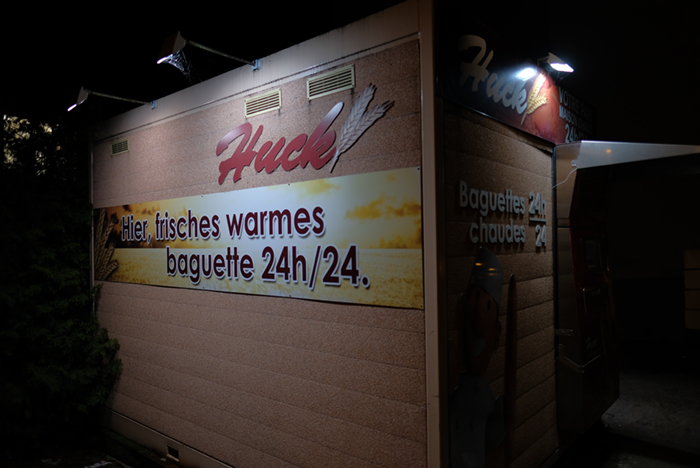 自動販売機というには少し大きめです。もしかすると中に人が入っているのかも、と思いました。因みに後ろに見える明かりはパン工場のものです。フランスですがドイツ語で「24時間焼きたてのバゲット」とあります。