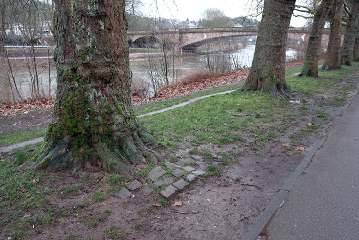 木の根っこに石が敷かれています。川の水位が上がったときに、木の根が浮かないようにするためでしょうか。