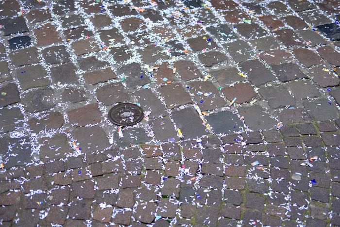 パレードは10分前後で終わりです。通り過ぎた後は紙吹雪が落ちています。