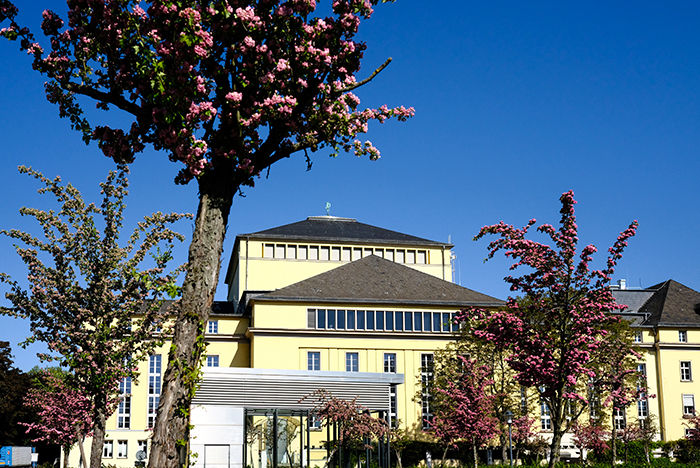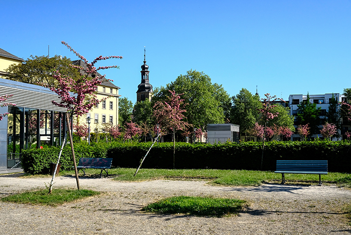 今日も非常に天気が良い一日でした。撮影に行く前の午前9時半頃に撮りました。ザールラント州立劇場の黄色、サルスベリの濃いピンク、木々の緑、濃い青空。そのコントラストが美しいです。ザール川沿いではデュアスロンが行われていました。デュアスロンとは複合競技の一種でラン、バイク、ランを行うというもの。トライアスロンの水泳をランに変えたものということです。多くのランナーが走って行きました。