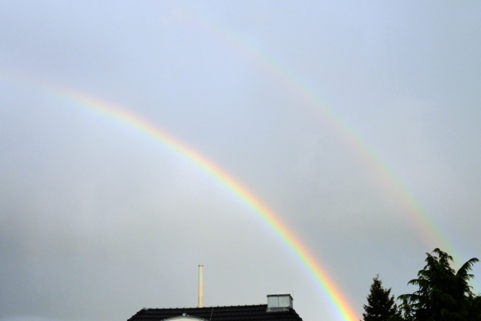 風があって肌寒い一日でした。夕方、窓の外を見るとかなり大きな2重の虹が出ていました。何か良いことがありそうです。