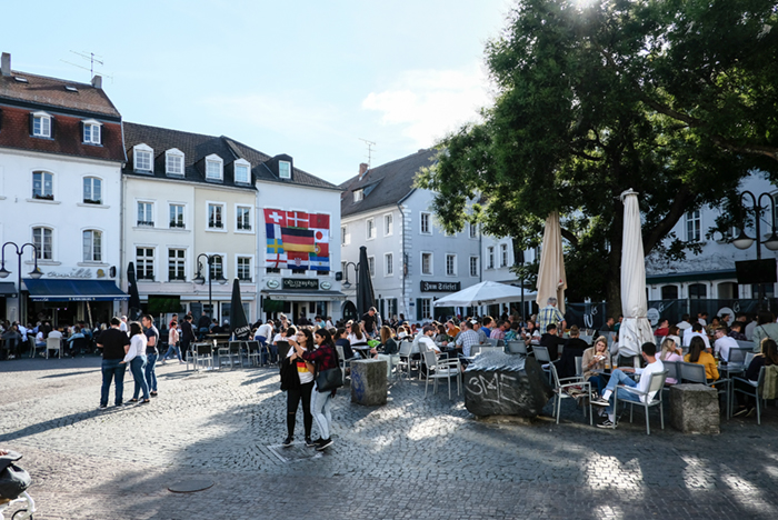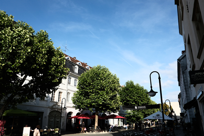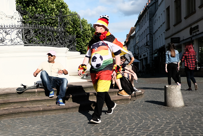 今日はサッカーワールドカップ、ドイツ戦があります。カフェやレストランで応援する人も多そうです。角の店には出場国の国旗が掲げられています。