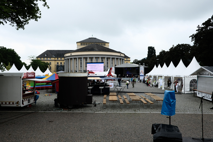 午前中、撮影に行く前に撮りました。ザールラント州立劇場前では臓器移植関連のイベントが行われるようで、その準備がなされていました。中央には救急へりも止まっています。