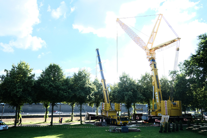 その横には大きなクレーンがあります。こちらはどういった風に使用されるか、最初見ただけでは分からなかったのですが、午後に見て分かりました。どうやらザール川に停泊している船が一昨日の雷雨で沈みかけており、それを引き上げるためにクレーンが出ているようです。