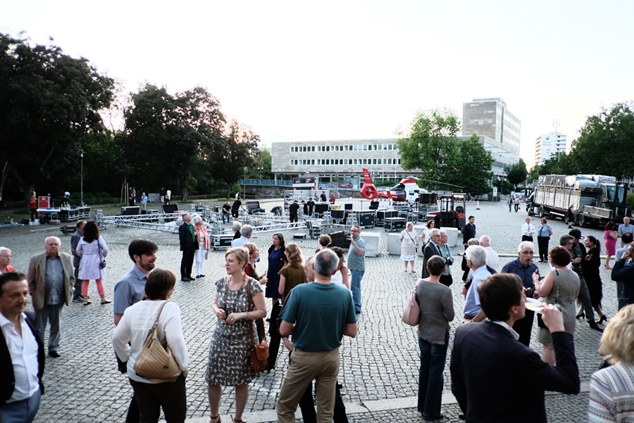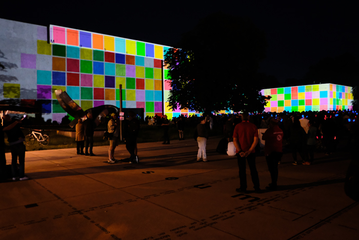 休憩後、後半が始まるとき指揮者が出てきたときにはブラヴォーが出て、演奏的にも満足した夜でした。その後、午後11時前ですが直ぐ近くのザールラント美術館前では音楽と映像のイベントが開催されていました。夜の開催だからか音楽はヘッドフォンで聴くようになっているようです。