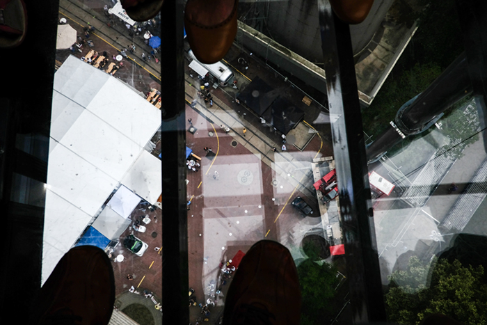 床は特殊なガラスで下が丸見えです。上まで行くと安定しますが、登りはじめの時は思った以上に揺れました。