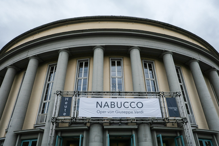 今日から日曜日まで街中ではアルトシュタットフェスト、直訳すれば、旧市街地フェストが開催されます。色々なお店が出て、幾つかの仮設ステージでは演奏があるので、言ってみれば文化祭のようなものです。色々な大音響が響く中、ザールラント州立劇場にオペラを観に行きました。ヴェルディ「ナブッコ」(1842年ミラノ初演)です。このお祭りの中では、劇場前は異空間のようにも見えます。劇場の直ぐ前には仮設ステージがあって、劇場正面入り口はその裏に隠れるようになっています。というわけで見上げて撮りました。