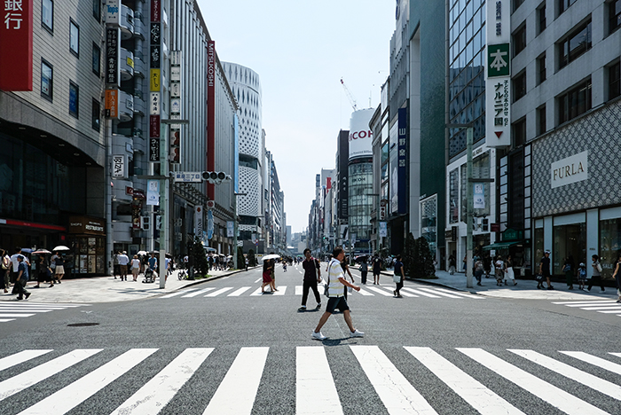 祝日で歩行者天国になっていますが、気温が高いだけでなく日差しが強いので、日が当たる道の真ん中を歩いている人は少ないです。