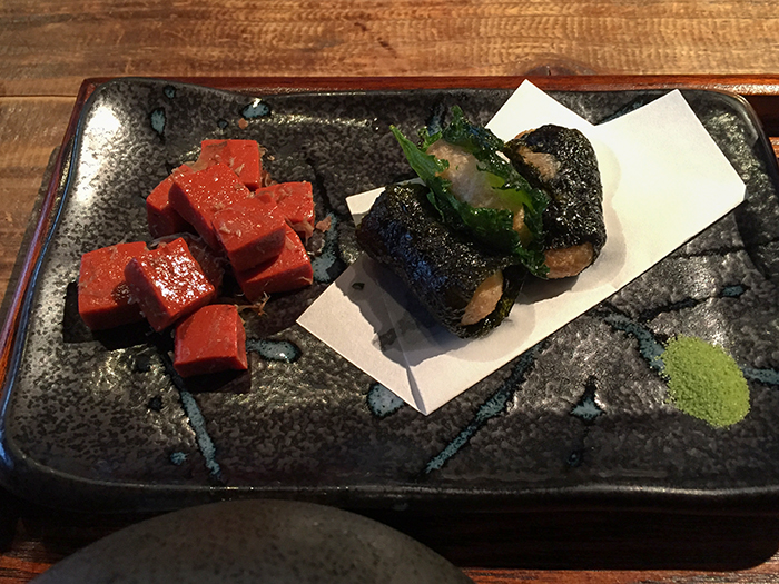 ランチで印象に残ったもの。右がとろろのあげものです。薄い海苔のようなものを想像していましたが、弾力があってお餅のような食感でした。
