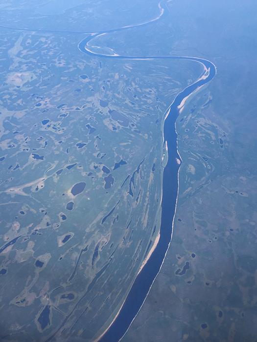 午前5時過ぎに家を出発。途中で関空特急はるかに乗り換えて関西空港に。飛行機が15分早発になりましたが、問題なく搭乗できました。ロシア上空で飛行機の窓から見た景色。大きな、蛇行した川が見えます。