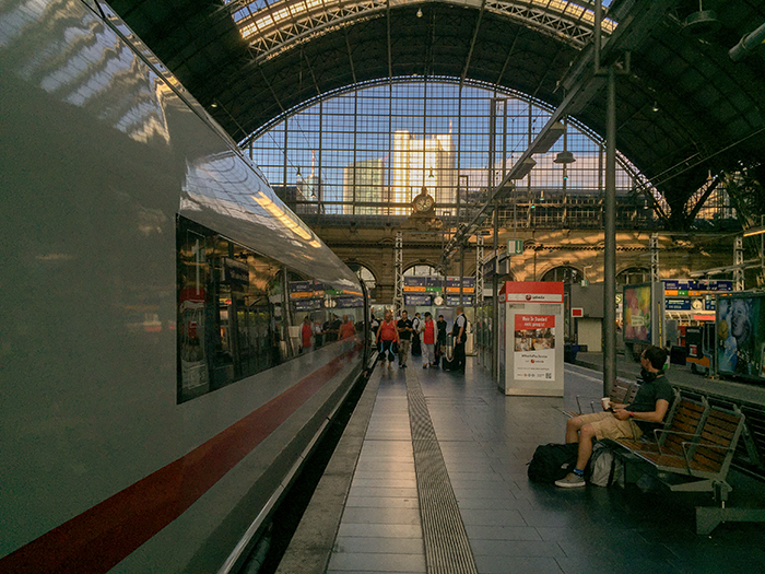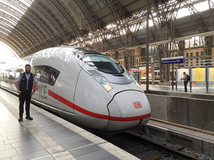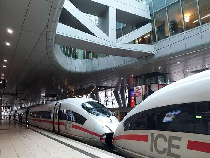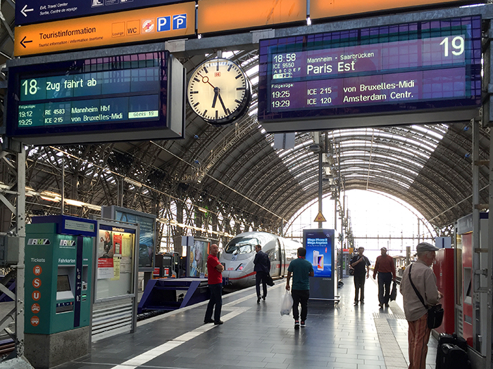 フランクフルト空港駅では待ち時間が約3時間あります。もっと早い電車が何本もありますが荷物が載せられることを考慮してICE(都市間超特急、ドイツ版新幹線)にしました。