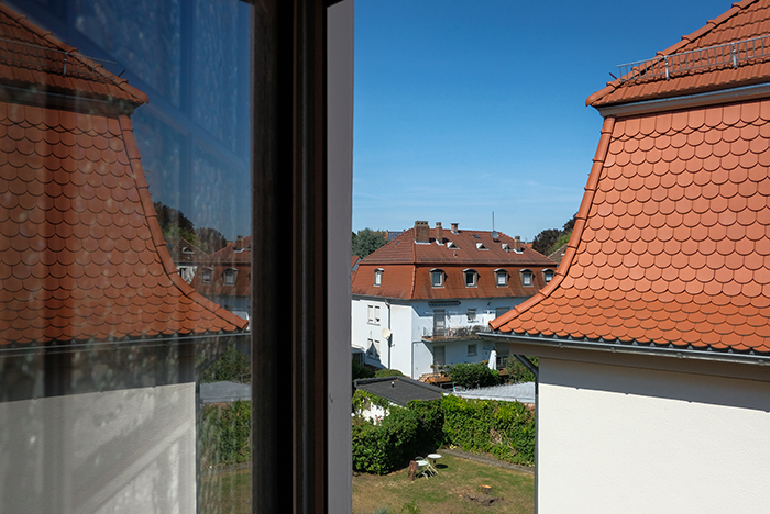 ザールブリュッケンの街角 晴れの日 by ey 2018年8月18日 時差ボケで朝の早い時間に目が覚めて、そのまま仕事をしています。青空と屋根の色が綺麗です。日中は時差ボケ解消のために外で太陽の光を受けるようにしています。これが効いてくれるといいのですが。