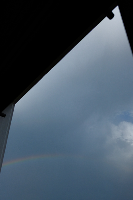 夕方、ちょうど外出先から家に着いたときに雨が降り始めました。晴れ間も出ていたので虹が出るかも、と期待していると濃くはないですが大きな虹が出ました。