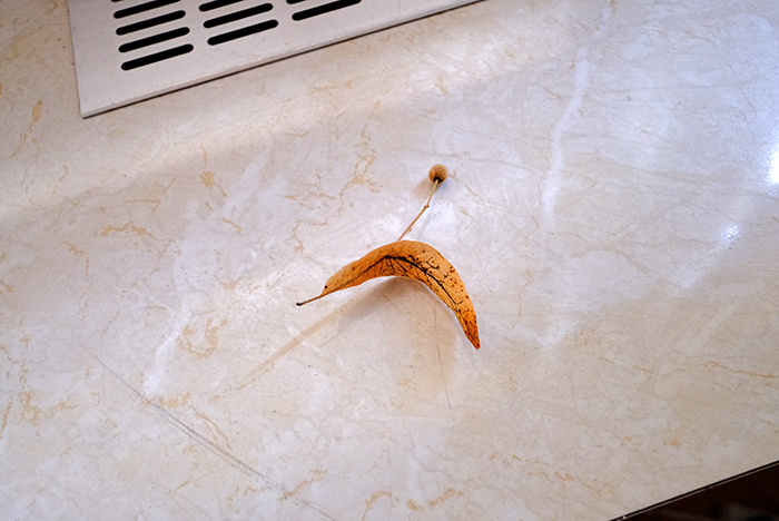 雨風が強かったので、窓を細く開けて虹を撮りましたが、窓を閉めると風で入ってきたのか見慣れぬ葉っぱがありました。