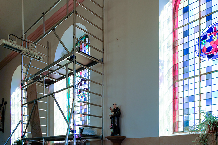教会に入ると時々音楽がなっていることがあります。ミサ関連だったり合唱曲だったり。しかしこの教会は全く関係ないような現代の音楽が聞こえています。足場があることから、どうやら作業している人たちが聴いているのかもしれません。
