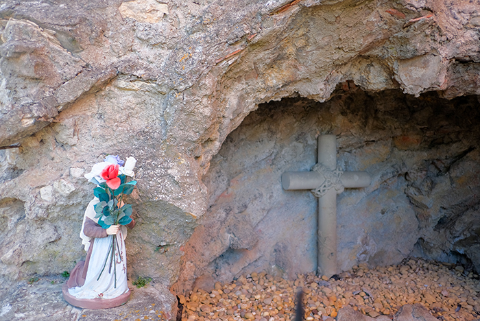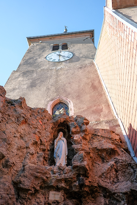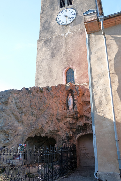 教会の塔の下には人工的に作られた小さな洞窟のような祠があり、マリア像が祭られています。