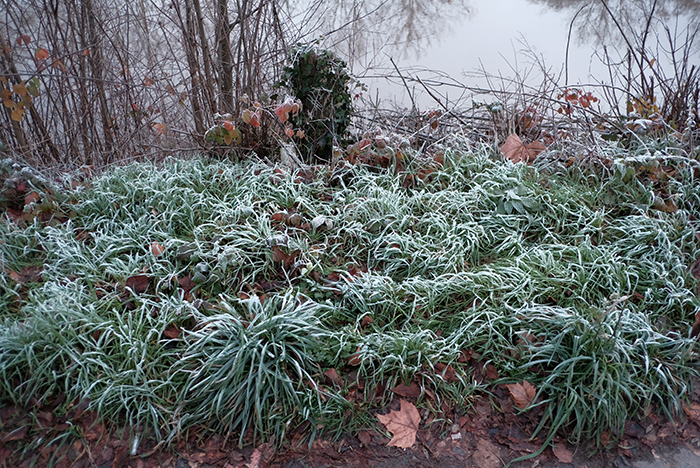 クリスマス祝日2日目です。夕方、外出先からの帰りに撮りました。午後5時前後で気温は-5度。背中を丸めたくなるような寒さです。近くの草だけでなく少し先にある小高い山などにも霜が降りています。