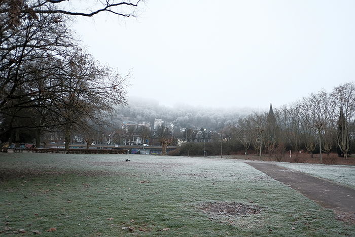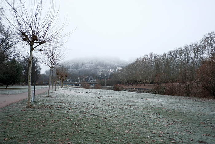 午前9時半ごろです。気温は-5度。冷たい空気が鼻の中を通ってきます。これが-10度以下になれば鼻が痛くて取れる感覚になりますが、まだそこまでは冷え込んでいません。昨日のように霜が降りています。少し幻想的な世界が広がっています。街中でもこのような雰囲気なので、山や谷の場所ではもっと幻想的になっているかもしれません。